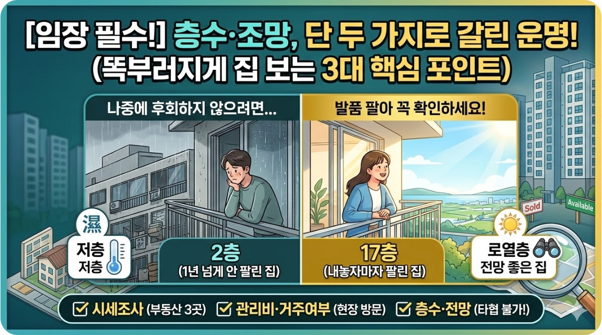 집을 볼 때마다 느끼는 건데, 정말 꼼꼼하게 보지 않으면 나중에 후회하게 되더라고요. 제 지인 두 명이 같은 아파트 단지에서 같은 평형을 샀는데, 한 명은 17층 전망 좋은 집을 내놓자마자 팔았고, 다른 한 명은 2층 집을 1년 넘게 내놔도 못 팔았습니다. 층수와 전망이라는 단 두 가지 차이만으로 이렇게 극명하게 갈리는 걸 직접 보니, 임장할 때 무엇을 봐야 하는지 정확히 알아야겠다는 생각이 들었습니다.